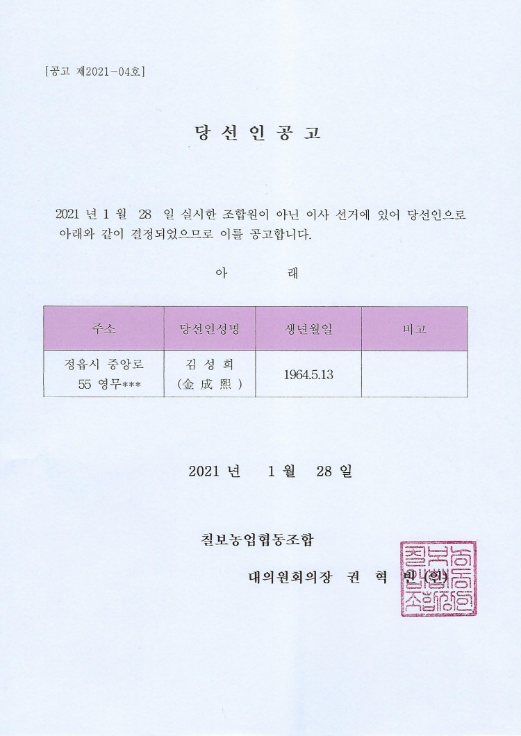 조합원이 아닌 이사(사외이사) 당선인 공고 페이지 정보 작성자 칠보농협 작성일21-01-28 15:05 조회3,682회 댓글0건 관련링크 이전글 다음글 목록 본문 2021.1.28. 실시된 조합원이 아닌 이사(사외이사)선거에 있어 붙임과 같이 당선인이 결정되었기에공고합니다. 붙 임 : 당선인 공고 1부 끝. 댓글목록 등록된 댓글이 없습니다. 이전글 다음글 목록